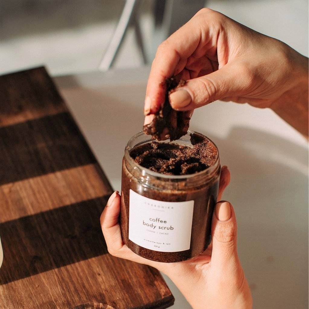 Аромат шоколада и утреннего кофе поднимет настроение и пробудит жизненную энергию. Все, что вам нужно – это пара минут в душе и наш кофейно-шоколадный скраб! Он густой, напитанный маслами, с очень мелкой морской солью. Скраб деликатно очищает кожу, массирует ее и запускает обменные процессы. После скраба не нужно наносить на тело масла или кремы: в его составе масло авокадо, оливы, лаванды, карите и масло какао, – они отлично увлажняют кожу.