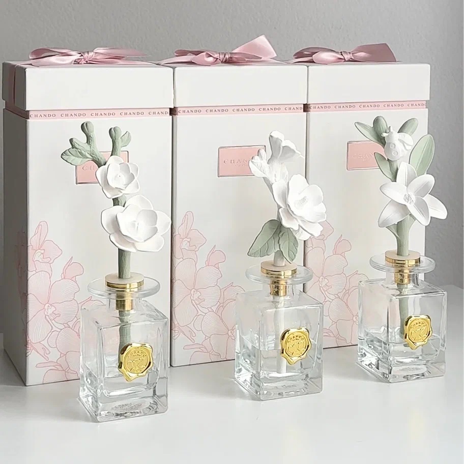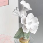 Цветы, кстати, изготовлены вручную из пористой керамики, она отлично впитывает аромат и отдает его вовне. Белоснежный цветок гибискуса – просто создан для светлого интерьера. Золотые детали красиво подчеркнут хрупкость диффузора. Подарочная коробка – в комплекте.
